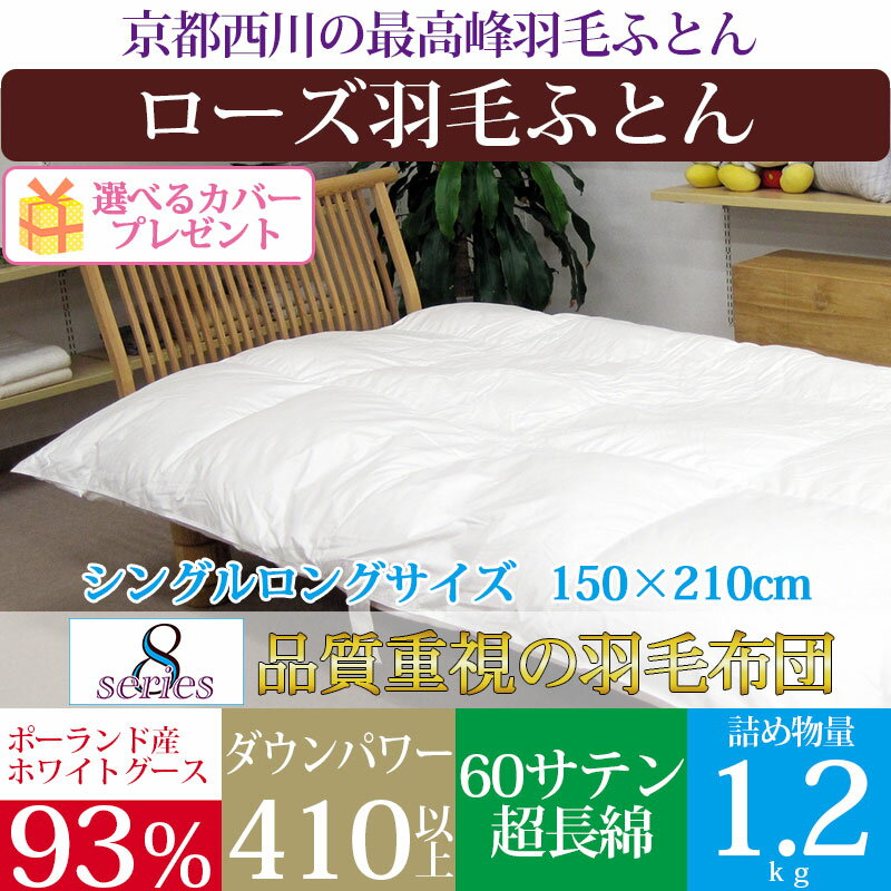 商品詳細 ◆商品お問合せ番号:uk8061-P93SL ◆メーカー:京都西川【ローズ羽毛】 ◆商品規格:ダウンパワー410以上 ■サイズ:シングルロング 150×210cm ■側生地:綿100%(60サテン超長綿) ■詰め物:ポーランド産ホワイトグースダウン93% フェザー7% ■詰め物量:1.2kg ■2層タイプ(ツインキルト-上層3×4マス:下層4×5マス) ■日本製 ◎商品説明 ●商品説明 ポーランド産ホワイトグースの品質を最大限活かすためには、側生地の品質も大切です。