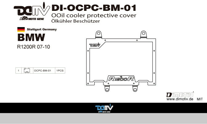 Application chart:1.This listing of Oil Cooler Protertive Cover fits:- BMW R1200R 06-10MATERIAL:6061-T6 Aluminum Alloy:Silicon 0.4-0.8%, Copper 0.15-0.4%, Magnesium0.8-1.2%, Chromium 0.404-0.35%, Ultimate Tensile Strength 290 MPa 42000 psi,Bearing Yield Strength 241 MPa 35000 psi, while thickness is lessthan0.25 (6.4mm)Tensile Strength is 8% or more.While thickness isgreater than 0.25 (6.4mm), Tensile Strength is 10%.SURFACE PROCESSING:General Anodic Process:Processing with IPHONE, IPAD standard, corrosionresistant and 60 hours anti-UV endurance (testing under 100eV UV exposure for60 hours before color start fading, whereas natural UV radiation is around3-10eV).FEATURE:Since oil cooling system is behind the front wheels, it’salways difficult to avoid being hit by stones.Oil cooling system may bedamaged over times, even broken.Dimotiv has tailored the Radiator ProtectiveCover.Aluminum alloy net with the frame in high carbon steel, can protect the oilcooling system efficiently.We provide black, gold and titanium as coloroption.Show out your personal style and protect your bike at the same time.ABOUT US:DIMOTIV products are designedspecifically for each model of motorcycle, these parts are essentialaccessories, whether in daily riding or on the track.These simple linescombine with perfect detailing, not only create an idea goes beyond thefunction, but also making a design statement and emphasizing aggressiveness andcharacater of your motorcycle.DIMOTIV products are made of Aluminium andDelrin which have high quality and better duration.■注意点※画像には他のカラーリングが含まれています。