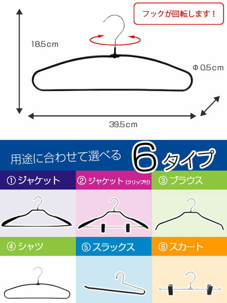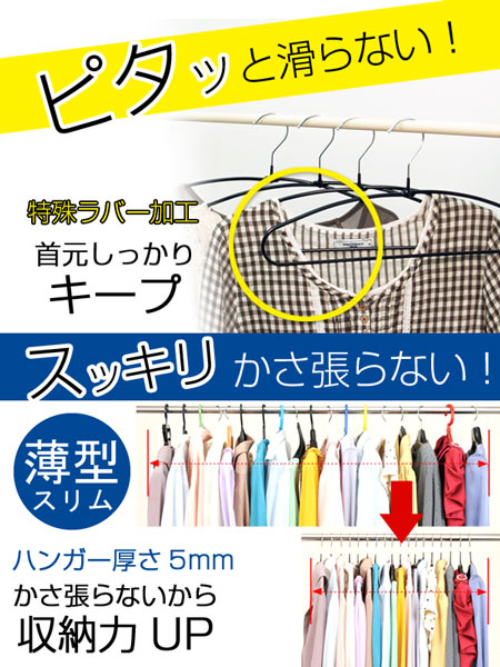 すべらない!落ちにくい!特殊ラバー加工により、すべり落ちを防ぎ、シャツやブラウス、カットソーなど薄くで軽い衣類も落ちにくい!形をキープしたまま収納できます! 薄型ハンガーで収納力UP!かさばる洋服もコンパクトにスッキリ収納できます!ハンガーを変えるだけで収納力が驚くほどアップします!厚さ5mmの薄型!薄型ハンガーだから、洋服を掛けてもかさばらない! 用途に合わせて6種類♪