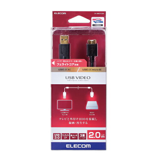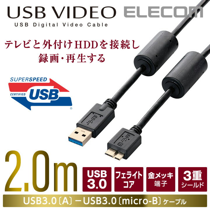 ■コネクタ形状:USB3.0(Standard-A)オス-USB3.0(Standard-MicroB)オス■対応機種:USB3.0(Aタイプ)端子搭載のTV、パソコン及びUSB3.0(Bタイプ)端子搭載のHDD等■ケーブル長:2.0m■ケーブル太さ:4.8mm■規格:USB3.0規格正規認証品■対応転送速度:最大5Gbps ※理論値■プラグメッキ仕様:金メッキピン・金メッキコネクタ■シールド方法:3重シールド■ツイストペアケーブル(通信線):○■カラー:ブラック■フェライトコア:○エレコムダイレクトショップJANコード:4953103499089ノイズ・読込みエラーを低減できるフェライトコアを搭載。